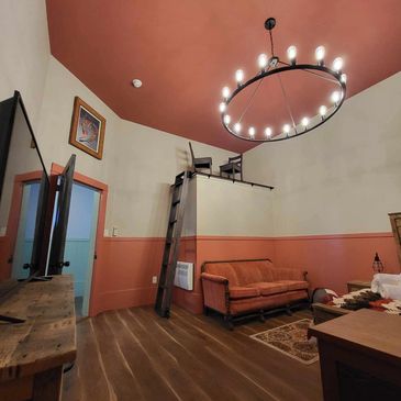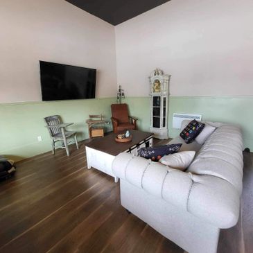 The living room has a lot of comfortable seating, including old school desks that have been restored. The living room has streaming TV with Netflix and other apps. available.