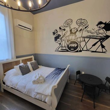 The second bedroom theme is the Music room. You will notice the instruments placed throughout, and this room features both a queen and a double bed, as well as a smart TV with Netflix and other apps available for use.